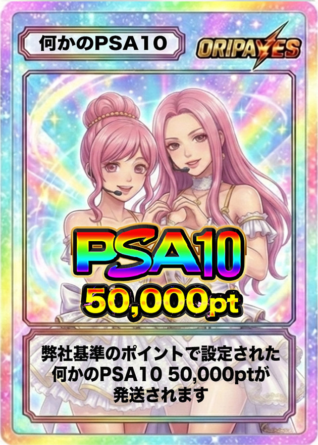 ポイント表記は弊社の基準で設定されたおります。 あらかじめご了承ください。 商品をポイントに変換してしまうと発送が出来なくなってしまいます。あらかじめご了承ください。 ポイントに傷ありカード・ケースについて オリパから排出されるカードおよび鑑定済みカード(ケース付き)には、傷やスレなどが見られる場合がございます。あらかじめご了承ください。 鑑定済みカード(PSA)について 鑑定済みカード(PSA)は、鑑定機関が付与したグレードを基準として販売しております。ケース内部の傷、異物、初期キズ等につきましては、クレーム・返品・交換の対象外となります。 未開封品の状態について 未開封品であっても、外箱の傷・凹み、シュリンクの破れやヨレ、シール跡などが見られる場合がございます。 また、BOX商品の再シュリンクの可能性を完全に排除することはできません。 商品到着後は、梱包状態が未開封であることが分かる状態から開封までを動画で撮影していただくことを推奨しております。動画内で偽造品であると確認できた場合のみ、返品・交換の対応をさせていただきます。 商品画像について 掲載している商品画像はイメージとなります。実際に排出されるカードの状態や内容を保証するものではございません。掲載されていないカードが排出される場合もございます。 販売個数表示について バナー等に表示されている販売個数は、販売開始時点での数を示しております。購入時点での残り販売数を示すものではございません。 総還元率について 総還元率は、オリパをすべて引いた場合の理論上の数値となります。 排出されるポイント額について 抽選により獲得できるカードの設定ポイント額はランダムとなっており、すべての抽選において1口あたりの設定ポイント額を保証するものではありません。 返品・交換について 商品の性質上、原則として返品・交換・返金には対応しておりません。 販売終了について 商品は予告なく販売を終了する場合がございます。 演出動画について 電波状況、端末、OSの環境によっては演出動画が正常に表示されない場合があります。その場合でも抽選結果および景品の排出には影響ございません。なお、利用したポイントの返還、商品交換、返金等には対応いたしかねます。 エディション表記のある商品の取り扱いについて エディション表記のある商品につきましては、番号の指定や保証はできません。あらかじめご了承ください。