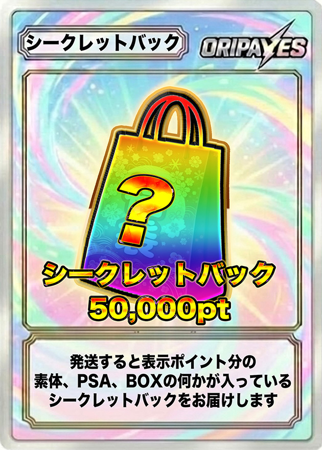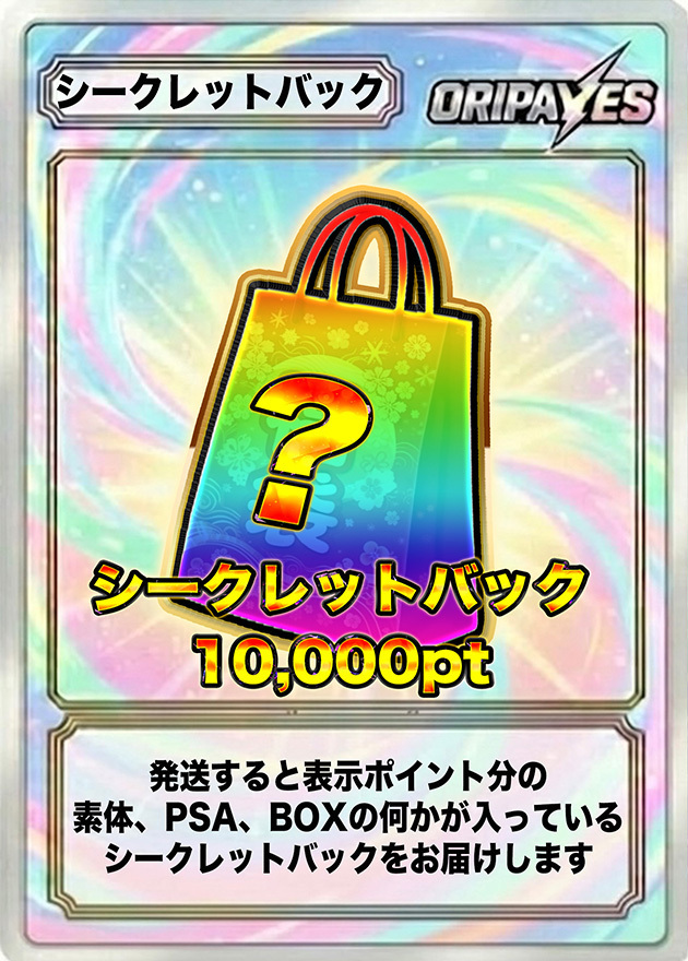 傷ありカード・ケースについて オリパから排出されるカードおよび鑑定済みカード(ケース付き)には、傷やスレなどが見られる場合がございます。あらかじめご了承ください。 鑑定済みカード(PSA)について 鑑定済みカード(PSA)は、鑑定機関が付与したグレードを基準として販売しております。ケース内部の傷、異物、初期キズ等につきましては、クレーム・返品・交換の対象外となります。 未開封品の状態について 未開封品であっても、外箱の傷・凹み、シュリンクの破れやヨレ、シール跡などが見られる場合がございます。 また、BOX商品の再シュリンクの可能性を完全に排除することはできません。 商品到着後は、梱包状態が未開封であることが分かる状態から開封までを動画で撮影していただくことを推奨しております。動画内で偽造品であると確認できた場合のみ、返品・交換の対応をさせていただきます。 商品画像について 掲載している商品画像はイメージとなります。実際に排出されるカードの状態や内容を保証するものではございません。掲載されていないカードが排出される場合もございます。 販売個数表示について バナー等に表示されている販売個数は、販売開始時点での数を示しております。購入時点での残り販売数を示すものではございません。 総還元率について 総還元率は、オリパをすべて引いた場合の理論上の数値となります。 排出されるポイント額について 抽選により獲得できるカードの設定ポイント額はランダムとなっており、すべての抽選において1口あたりの設定ポイント額を保証するものではありません。 返品・交換について 商品の性質上、原則として返品・交換・返金には対応しておりません。 販売終了について 商品は予告なく販売を終了する場合がございます。 演出動画について 電波状況、端末、OSの環境によっては演出動画が正常に表示されない場合があります。その場合でも抽選結果および景品の排出には影響ございません。なお、利用したポイントの返還、商品交換、返金等には対応いたしかねます。 エディション表記のある商品の取り扱いについて エディション表記のある商品につきましては、番号の指定や保証はできません。あらかじめご了承ください。