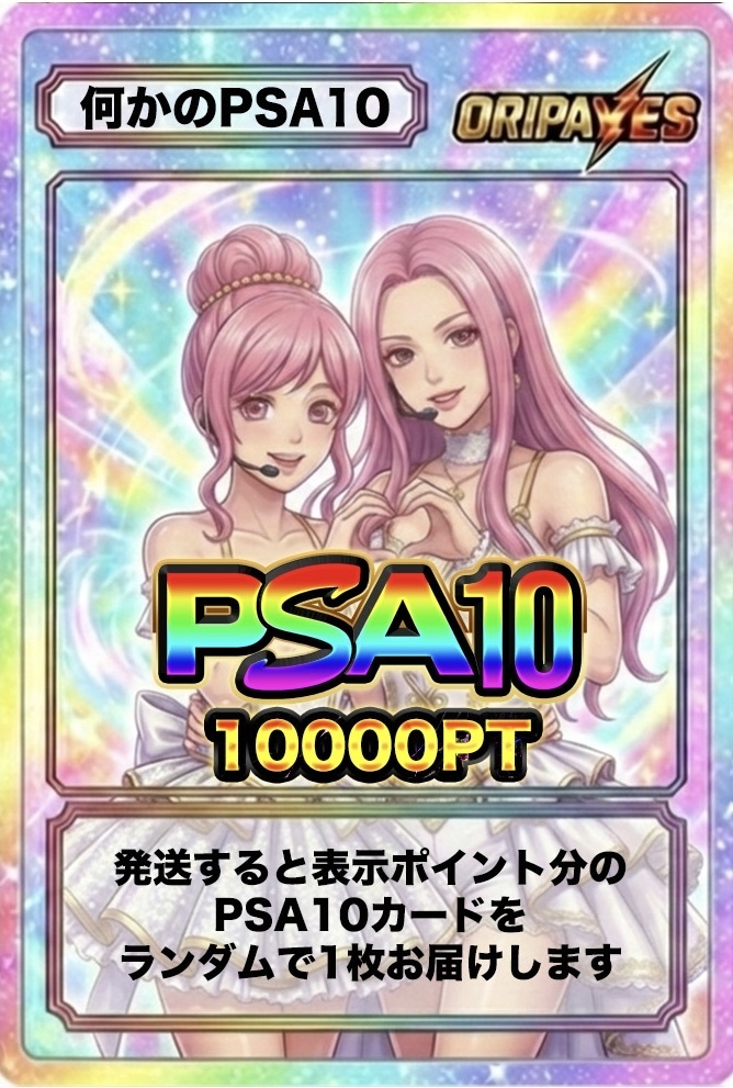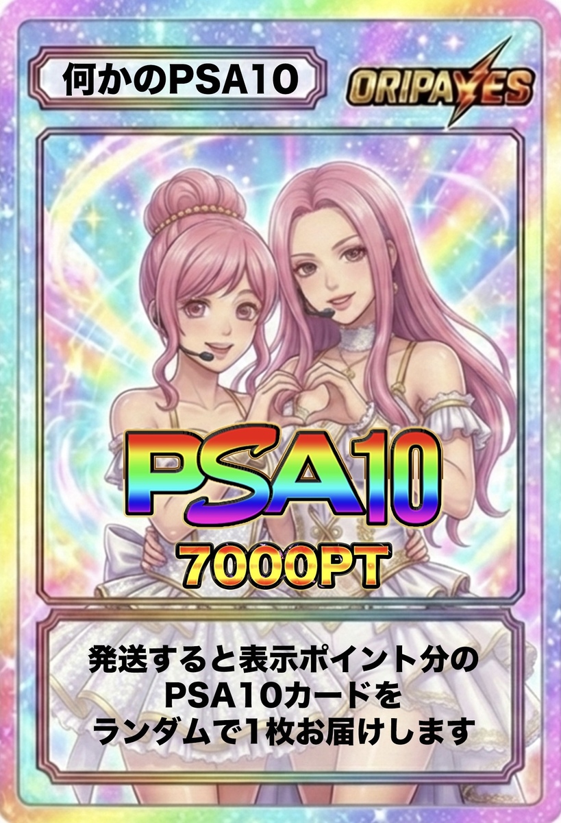傷ありカード・ケースについて オリパから排出されるカードおよび鑑定済みカード(ケース付き)には、傷やスレなどが見られる場合がございます。あらかじめご了承ください。 鑑定済みカード(PSA)について 鑑定済みカード(PSA)は、鑑定機関が付与したグレードを基準として販売しております。ケース内部の傷、異物、初期キズ等につきましては、クレーム・返品・交換の対象外となります。 未開封品の状態について 未開封品であっても、外箱の傷・凹み、シュリンクの破れやヨレ、シール跡などが見られる場合がございます。 また、BOX商品の再シュリンクの可能性を完全に排除することはできません。 商品到着後は、梱包状態が未開封であることが分かる状態から開封までを動画で撮影していただくことを推奨しております。動画内で偽造品であると確認できた場合のみ、返品・交換の対応をさせていただきます。 商品画像について 掲載している商品画像はイメージとなります。実際に排出されるカードの状態や内容を保証するものではございません。掲載されていないカードが排出される場合もございます。 販売個数表示について バナー等に表示されている販売個数は、販売開始時点での数を示しております。購入時点での残り販売数を示すものではございません。 総還元率について 総還元率は、オリパをすべて引いた場合の理論上の数値となります。 排出されるポイント額について 抽選により獲得できるカードの設定ポイント額はランダムとなっており、すべての抽選において1口あたりの設定ポイント額を保証するものではありません。 返品・交換について 商品の性質上、原則として返品・交換・返金には対応しておりません。 販売終了について 商品は予告なく販売を終了する場合がございます。 演出動画について 電波状況、端末、OSの環境によっては演出動画が正常に表示されない場合があります。その場合でも抽選結果および景品の排出には影響ございません。なお、利用したポイントの返還、商品交換、返金等には対応いたしかねます。 エディション表記のある商品の取り扱いについて エディション表記のある商品につきましては、番号の指定や保証はできません。あらかじめご了承ください。